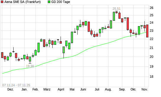Mit dem Rücksetzer auf 22,24 EUR hat die Aena SME-Aktie am 06.11.2025 die 200-Tage-Linie nach unten gekreuzt.Die Aena SME-Aktie befand sich seit dem 10.10.2025 im langfristigen Aufwärtstrend ...weiterlesen