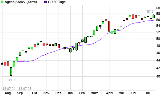 Mit dem Anstieg auf 56,90 EUR hat die Ageas-Aktie am 17.07.2025 die 50-Tage-Linie nach oben gekreuzt.Die Ageas-Aktie befindet sich seit dem 08.08.2024 im langfristigen Aufwärtstrend und hat ...weiterlesen