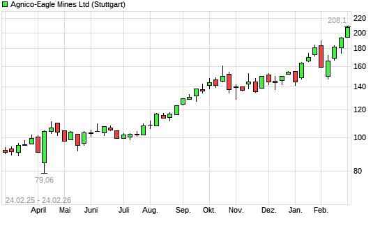 Mit dem Anstieg auf 203,50 EUR hat die Agnico-Eagle Mines-Aktie (ISIN CA0084741085) am 23.02.2026 ein neues All-Time-High erreicht und damit den Kurs vom 20.02.2026 ...weiterlesen