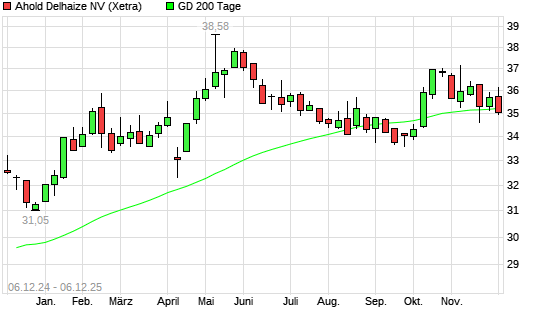 Mit dem Rücksetzer auf 34,62 EUR hat die Ahold Delhaize-Aktie am 05.12.2025 die 200-Tage-Linie nach unten gekreuzt.Die Ahold Delhaize-Aktie befand sich seit dem 24.11.2025 im langfristigen ...weiterlesen