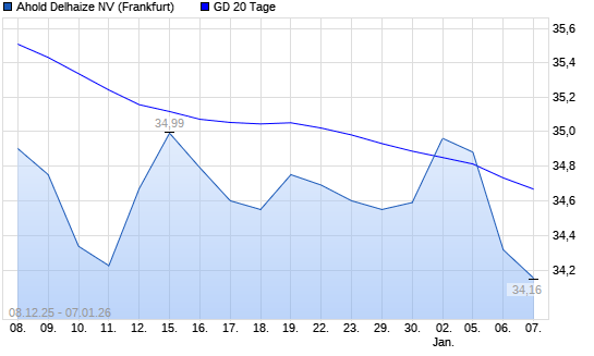 Mit dem Rücksetzer auf 34,32 EUR hat die Ahold Delhaize-Aktie am 06.01.2026 die 20-Tage-Linie nach unten gekreuzt.Die Ahold Delhaize-Aktie befindet sich seit dem 05.12.2025 ...weiterlesen