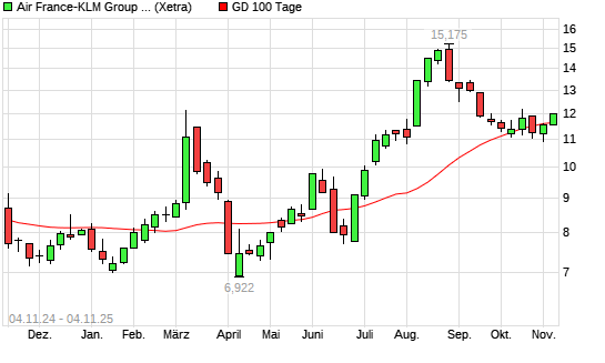 Mit dem Anstieg auf 11,73 EUR hat die Air France-KLM-Aktie am 03.11.2025 die 100-Tage-Linie nach oben gekreuzt.Die Air France-KLM-Aktie befindet sich seit dem 24.06.2025 im langfristigen Aufwärtstrend ...weiterlesen