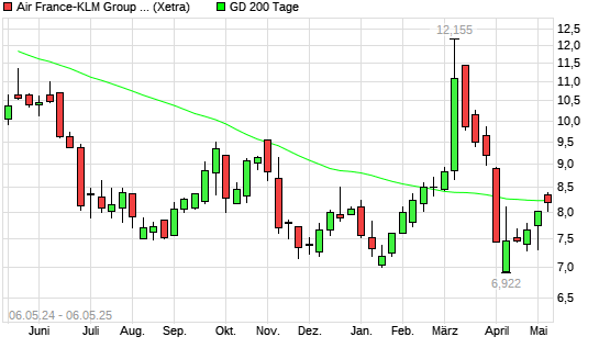 Mit dem Anstieg auf 8,31 EUR hat die Air France-KLM-Aktie am 05.05.2025 die 200-Tage-Linie nach oben gekreuzt.Die Air France-KLM-Aktie befand sich seit dem 03.04.2025 im langfristigen Abwärtstrend ...weiterlesen