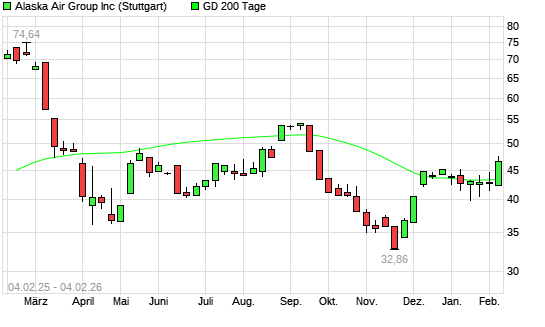 Mit dem Anstieg auf 44,57 EUR hat die Alaska Air Group-Aktie am 03.02.2026 die 200-Tage-Linie nach oben gekreuzt.Die Alaska Air Group-Aktie befand sich seit dem 02.02.2026 im langfristigen Abwärtstrend ...weiterlesen