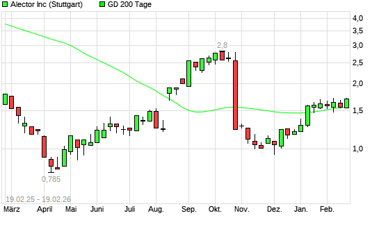 Mit dem Anstieg auf 1,64 EUR hat die Alector-Aktie am 18.02.2026 die 200-Tage-Linie nach oben gekreuzt.Die Alector-Aktie befand sich seit dem 16.02.2026 im langfristigen Abwärtstrend ...weiterlesen