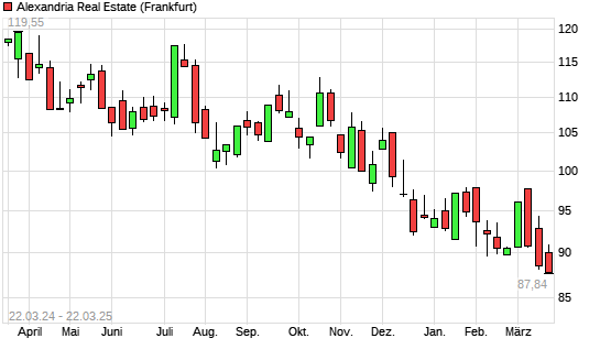 Mit dem Rücksetzer auf 87,84 EUR hat die Alexandria Real Estate-Aktie (ISIN US0152711091) am 21.03.2025 ein neues 12-Monats-Tief erreicht und damit den Kurs vom 19.03.2025 eingestellt.Die ...weiterlesen