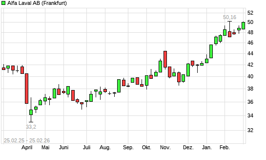 Mit dem Anstieg auf 50,06 EUR hat die Alfa Laval-Aktie (ISIN SE0000695876) am 24.02.2026 ein neues All-Time-High erreicht und damit den Kurs vom 02.02.2026 eingestellt.Die Alfa ...weiterlesen