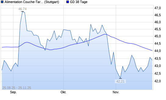 Mit dem Anstieg auf 44,20 EUR hat die Alimentation Couche-Tard-Aktie am 24.11.2025 die 38-Tage-Linie nach oben gekreuzt.Die Alimentation Couche-Tard-Aktie befindet sich seit dem 28.10.2025 im ...weiterlesen
