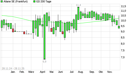 Mit dem Rücksetzer auf 10,00 EUR hat die Allane-Aktie am 27.11.2025 die 200-Tage-Linie nach unten gekreuzt.Die Allane-Aktie befand sich seit dem 25.11.2025 im langfristigen Aufwärtstrend ...weiterlesen