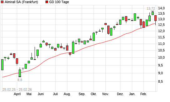 Mit dem Rücksetzer auf 12,48 EUR hat die Almirall-Aktie am 24.02.2026 die 100-Tage-Linie nach unten gekreuzt.Die Almirall-Aktie befindet sich seit dem 10.04.2025 im ...weiterlesen