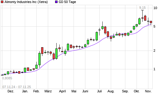 Mit dem Anstieg auf 5,53 EUR hat die Almonty Industries-Aktie am 06.11.2025 die 50-Tage-Linie nach oben gekreuzt.Der Abstand zur 200-Tage-Linie beträgt ...weiterlesen
