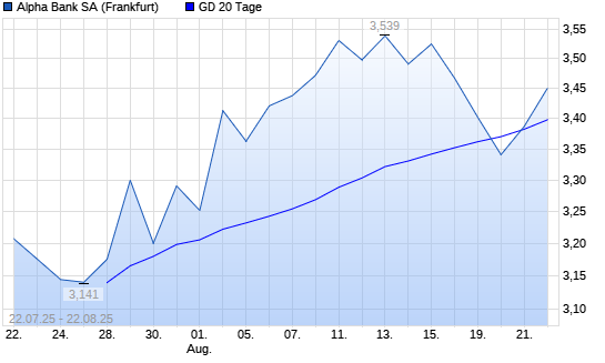 Mit dem Anstieg auf 3,46 EUR hat die Alpha Bank-Aktie am 21.08.2025 die 20-Tage-Linie nach oben gekreuzt.Der Abstand zur 200-Tage-Linie beträgt aktuell +51,47%. Die ...weiterlesen
