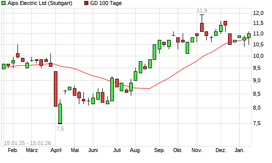 Mit dem Anstieg auf 10,80 EUR hat die Alps Electric-Aktie am 14.01.2026 die 100-Tage-Linie nach oben gekreuzt.Die Alps Electric-Aktie befindet sich seit dem 31.07.2025 im ...weiterlesen
