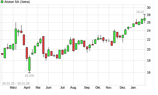 Mit dem Anstieg auf 27,73 EUR hat die Alstom-Aktie (ISIN FR0010220475) am 29.01.2026 ein neues 12-Monats-Hoch erreicht und damit den Kurs vom 28.01.2026 eingestellt.Die Alstom-Aktie befindet ...weiterlesen