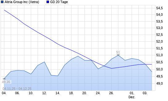 Mit dem Rücksetzer auf 50,34 EUR hat die Altria-Aktie am 03.12.2025 die 20-Tage-Linie nach unten gekreuzt.Die Altria-Aktie befindet sich seit dem 30.10.2025 im ...weiterlesen