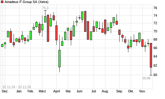 Mit dem Rücksetzer auf 59,38 EUR hat die Amadeus IT-Aktie (ISIN ES0109067019) am 21.11.2025 ein neues 12-Monats-Tief erreicht und damit den Kurs vom 20.11.2025 eingestellt.Die Amadeus IT-Aktie ...weiterlesen