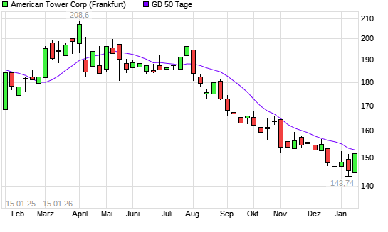 Mit dem Anstieg auf 154,72 EUR hat die American Tower-Aktie am 14.01.2026 die 50-Tage-Linie nach oben gekreuzt.Die American Tower-Aktie befindet sich seit dem 30.07.2025 im langfristigen Abwärtstrend ...weiterlesen