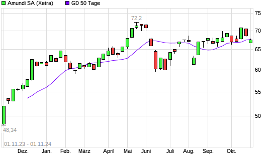 Mit dem Rücksetzer auf 66,40 EUR hat die Amundi-Aktie am 31.10.2024 die 50-Tage-Linie nach unten gekreuzt.Die Amundi-Aktie befindet sich seit dem 12.08.2024 im langfristigen Aufwärtstrend ...weiterlesen