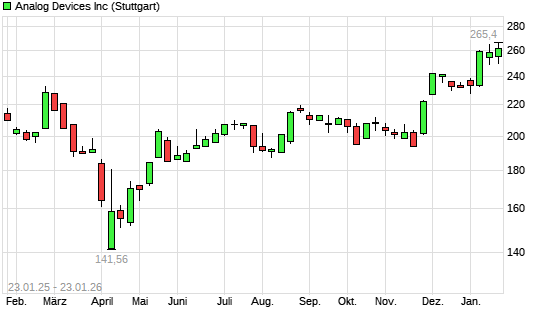 Mit dem Anstieg auf 262,35 EUR hat die Analog Devices-Aktie (ISIN US0326541051) am 22.01.2026 ein neues All-Time-High erreicht und damit den Kurs vom 16.01.2026 eingestellt.Die Analog Devices-Aktie ...weiterlesen
