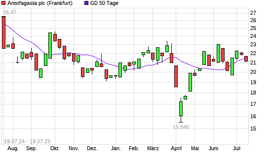 Mit dem Rücksetzer auf 21,13 EUR hat die Antofagasta-Aktie am 18.07.2025 die 50-Tage-Linie nach unten gekreuzt.Die Antofagasta-Aktie befindet sich seit dem 27.06.2025 im langfristigen Aufwärtstrend ...weiterlesen