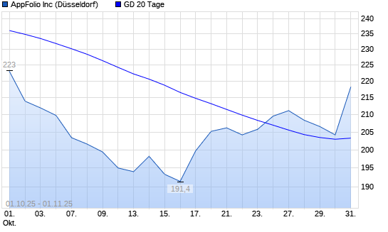 Mit dem Anstieg auf 221,00 EUR hat die AppFolio-Aktie am 03.11.2025 die 200-Tage-Linie nach oben gekreuzt.Die AppFolio-Aktie befand sich seit dem 30.10.2025 im langfristigen Abwärtstrend und ...weiterlesen