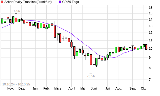 Mit dem Rücksetzer auf 9,95 EUR hat die Arbor Realty Trust-Aktie am 09.10.2025 die 50-Tage-Linie nach unten gekreuzt.Die Arbor Realty Trust-Aktie befindet sich seit dem 21.02.2025 im langfristigen ...weiterlesen