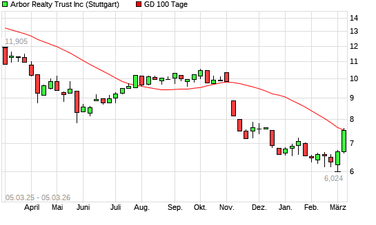 Mit dem Anstieg auf 7,60 EUR hat die Arbor Realty Trust-Aktie am 04.03.2026 die 100-Tage-Linie nach oben gekreuzt.Die Arbor Realty Trust-Aktie befindet sich seit dem 21.02.2025 ...weiterlesen