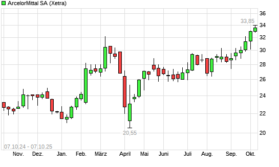 Mit dem Anstieg auf 33,11 EUR hat die ArcelorMittal-Aktie (ISIN LU1598757687) am 06.10.2025 ein neues 10-Jahres-Hoch erreicht und damit den Kurs vom 03.10.2025 eingestellt.Die ArcelorMittal-Aktie ...weiterlesen
