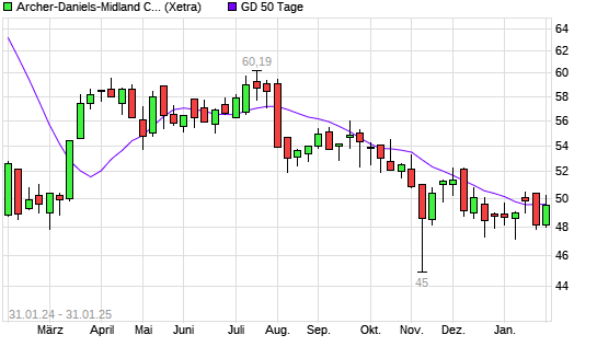 Mit dem Anstieg auf 49,62 EUR hat die Archer-Daniels-Midland-Aktie am 30.01.2025 die 50-Tage-Linie nach oben gekreuzt.Die Archer-Daniels-Midland-Aktie befindet sich seit dem 30.07.2024 im langfristigen ...weiterlesen