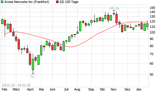 Mit dem Rücksetzer auf 116,06 EUR hat die Arista Networks-Aktie am 23.01.2026 die 100-Tage-Linie nach unten gekreuzt.Die Arista Networks-Aktie befindet sich seit dem 09.07.2025 im langfristigen ...weiterlesen
