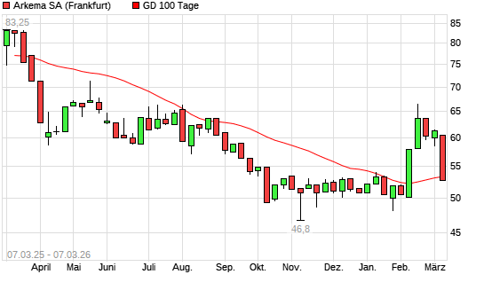 Mit dem Rücksetzer auf 52,65 EUR hat die Arkema-Aktie am 06.03.2026 die 100-Tage-Linie nach unten gekreuzt.Die Arkema-Aktie befindet sich seit dem 05.03.2026 im ...weiterlesen