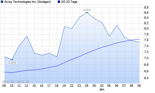 Mit dem Rücksetzer auf 7,64 EUR hat die Array Technologies-Aktie am 08.01.2026 die 20-Tage-Linie nach unten gekreuzt.Die Array Technologies-Aktie befindet sich seit dem 26.11.2025 im langfristigen ...weiterlesen