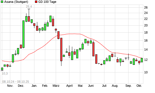 Mit dem Anstieg auf 12,20 EUR hat die Asana-Aktie am 07.10.2025 die 100-Tage-Linie nach oben gekreuzt.Die Asana-Aktie befindet sich seit dem 04.06.2025 im langfristigen Abwärtstrend und hat ...weiterlesen