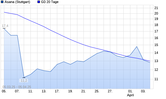 Mit dem Rücksetzer auf 12,50 EUR hat die Asana-Aktie am 04.04.2025 die 20-Tage-Linie nach unten gekreuzt.Die Asana-Aktie befindet sich seit dem 10.03.2025 im langfristigen Abwärtstrend ...weiterlesen