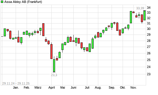 Mit dem Anstieg auf 33,39 EUR hat die Assa Abloy AB B-Aktie (ISIN SE0007100581) am 28.11.2025 ein neues All-Time-High erreicht und damit den Kurs vom 24.10.2025 eingestellt.Die Assa Abloy AB ...weiterlesen