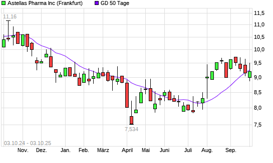 Mit dem Anstieg auf 9,50 EUR hat die Astellas Pharma-Aktie am 02.10.2025 die 50-Tage-Linie nach oben gekreuzt.Die Astellas Pharma-Aktie befindet sich seit dem 31.07.2025 im langfristigen Aufwärtstrend ...weiterlesen