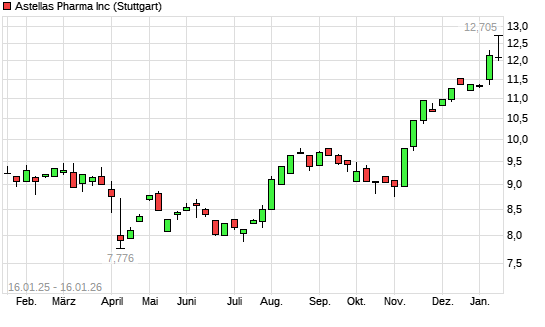 Mit dem Anstieg auf 12,15 EUR hat die Astellas Pharma-Aktie (ISIN JP3942400007) am 15.01.2026 ein neues 12-Monats-Hoch erreicht und damit den Kurs vom 14.01.2026 eingestellt.Die Astellas Pharma-Aktie ...weiterlesen