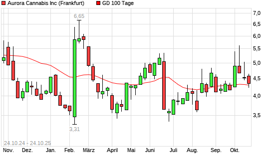 Mit dem Anstieg auf 4,31 EUR hat die Aurora Cannabis-Aktie am 23.10.2025 die 100-Tage-Linie nach oben gekreuzt.Die Aurora Cannabis-Aktie befindet sich seit dem 22.10.2025 im langfristigen Abwärtstrend ...weiterlesen
