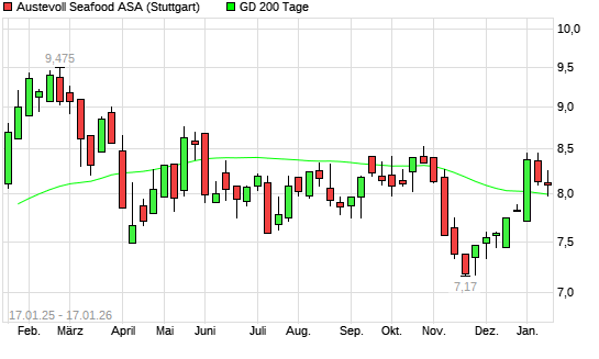 Mit dem Anstieg auf 8,11 EUR hat die Austevoll Seafood-Aktie am 16.01.2026 die 200-Tage-Linie nach oben gekreuzt.Die Austevoll Seafood-Aktie befand sich seit dem 15.01.2026 im langfristigen ...weiterlesen