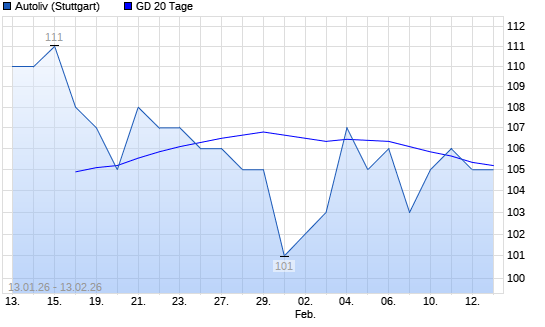 Mit dem Anstieg auf 106,00 EUR hat die Autoliv-Aktie am 12.02.2026 die 20-Tage-Linie nach oben gekreuzt.Die Autoliv-Aktie befindet sich seit dem 03.02.2026 im langfristigen ...weiterlesen