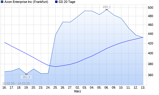 Mit dem Rücksetzer auf 432,30 EUR hat die Axon Enterprise-Aktie am 13.03.2026 die 20-Tage-Linie nach unten gekreuzt.Die Axon Enterprise-Aktie befindet sich seit dem 05.11.2025 ...weiterlesen