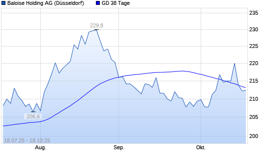 Mit dem Rücksetzer auf 211,60 EUR hat die Bâloise-Holding-Aktie am 17.10.2025 die 38-Tage-Linie nach unten gekreuzt.Die Bâloise-Holding-Aktie befindet sich seit dem 03.05.2024 im ...weiterlesen