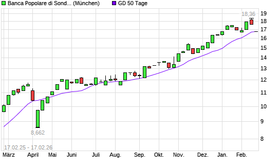 Mit dem Rücksetzer auf 16,44 EUR hat die BCA Pop di Sondrio-Aktie am 16.02.2026 die 50-Tage-Linie nach unten gekreuzt.Die BCA Pop di Sondrio-Aktie befindet sich seit dem 05.11.2024 ...weiterlesen