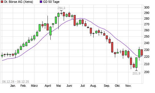 Mit dem Anstieg auf 222,80 EUR hat die Deutsche Börse-Aktie am 05.12.2025 die 50-Tage-Linie nach oben gekreuzt.Die Deutsche Börse-Aktie befindet sich seit dem 28.08.2025 im langfristigen ...weiterlesen