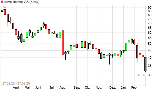 Mit dem Rücksetzer auf 31,98 EUR hat die Novo Nordisk-Aktie (ISIN DK0062498333) am 26.02.2026 ein neues 3-Jahres-Tief erreicht und damit den Kurs vom 25.02.2026 eingestellt.Die ...weiterlesen