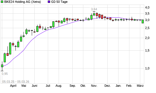 Mit dem Anstieg auf 3,00 EUR hat die BIKE24 Holding AG-Aktie am 04.03.2026 die 50-Tage-Linie nach oben gekreuzt.Die BIKE24 Holding AG-Aktie befindet sich seit dem 10.03.2025 ...weiterlesen