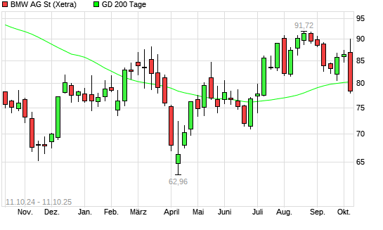 Mit dem Rücksetzer auf 78,60 EUR hat die BMW St-Aktie am 10.10.2025 die 200-Tage-Linie nach unten gekreuzt.Die BMW St-Aktie befand sich seit dem 02.07.2025 im langfristigen Abwärtstrend ...weiterlesen