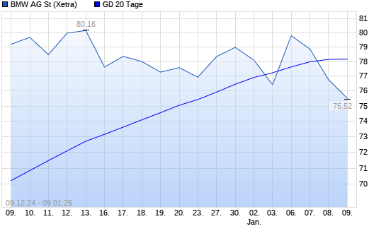 Mit dem Rücksetzer auf 76,98 EUR hat die BMW St-Aktie am 08.01.2025 die 20-Tage-Linie nach unten gekreuzt.Die BMW St-Aktie befindet sich seit dem 16.05.2024 im langfristigen Abwärtstrend ...weiterlesen