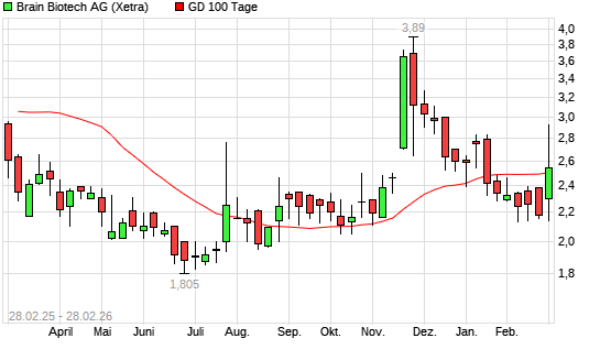 Mit dem Rücksetzer auf 2,47 EUR hat die BRAIN Biotech AG-Aktie am 27.02.2026 die 100-Tage-Linie nach unten gekreuzt.Die BRAIN Biotech AG-Aktie befindet sich seit dem 24.02.2026 ...weiterlesen