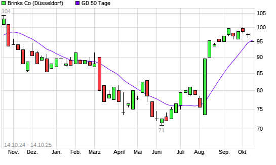 Mit dem Rücksetzer auf 94,50 EUR hat die BRINKS CO-Aktie am 13.10.2025 die 50-Tage-Linie nach unten gekreuzt.Die BRINKS CO-Aktie befindet sich seit dem 07.08.2025 im langfristigen Aufwärtstrend ...weiterlesen